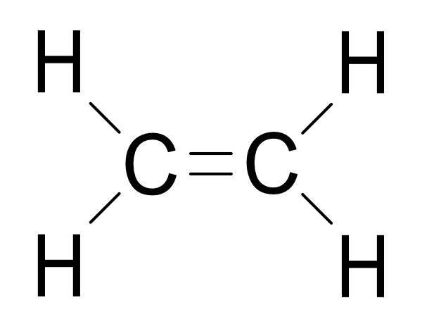 エチレンの化学構造式 イラスト 2021.09.15 示性式 H2C=CH2 無色可燃性の気体。アルコールと濃硫酸とを熱すると生じる。工業的にはエタンの脱水素またはナフサの熱分解によって製する。石油化学工業の重要な基礎原料。また、植物中に生成し、植物ホルモンの一つとして果実の成熟、落葉・落果の促進などの生理作用を示す。(『広辞苑 第七版』) ダウンロード